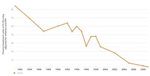 No hace muchos años, la pobreza en el mundo tenía su mayor epicentro en China. En 1981, primeros datos del Banco Mundial, el 88 % de la población china era pobre, esto es 880 millones de personas. De acuerdo con la última estimación del Banco Mundial, en 2019 el porcentaje de pobreza (International poverty rate) es del 0,3 %, esto es, algo más de 4 millones de personas sobre los 1.395 millones de habitantes (5,51 millones en el cálculo que hace la propia China).